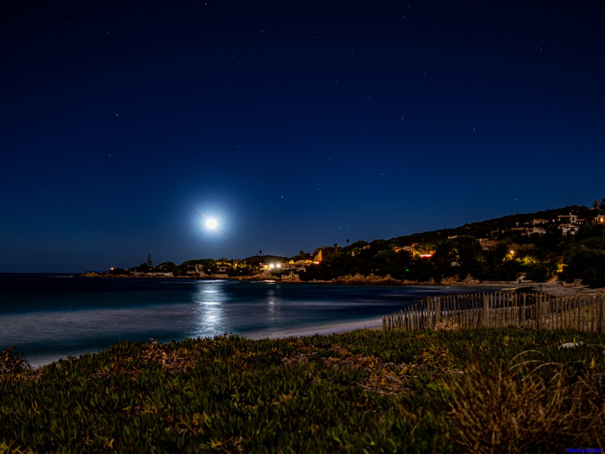 Cette photo mérite une explication: La Lune, pleine et étincellante est encore haut dans le ciel, dans mon dos. Je fais des photos en pause longue. Un avion en approche d'Ajaccio fais route vers moi avant de virer à Gauche pour s'aligner sur la piste.