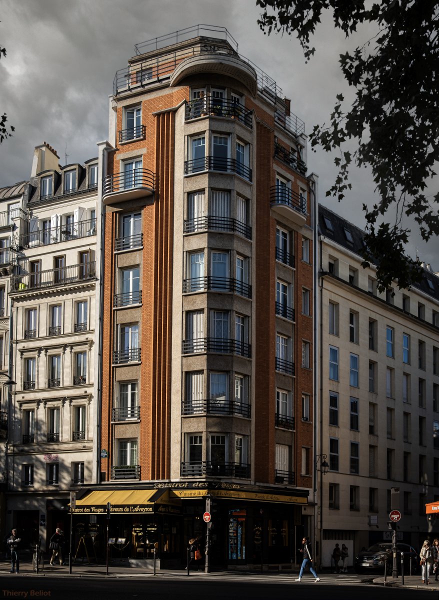 Comme une sentinelle à l'entrée du quartier du Marais, au coin du Boulevard Beaumarchais et de la rue du Pas de la Mule,à Paris, un immeuble à structure métallique art déco de l'arcitecte Sachs construit en 1934.