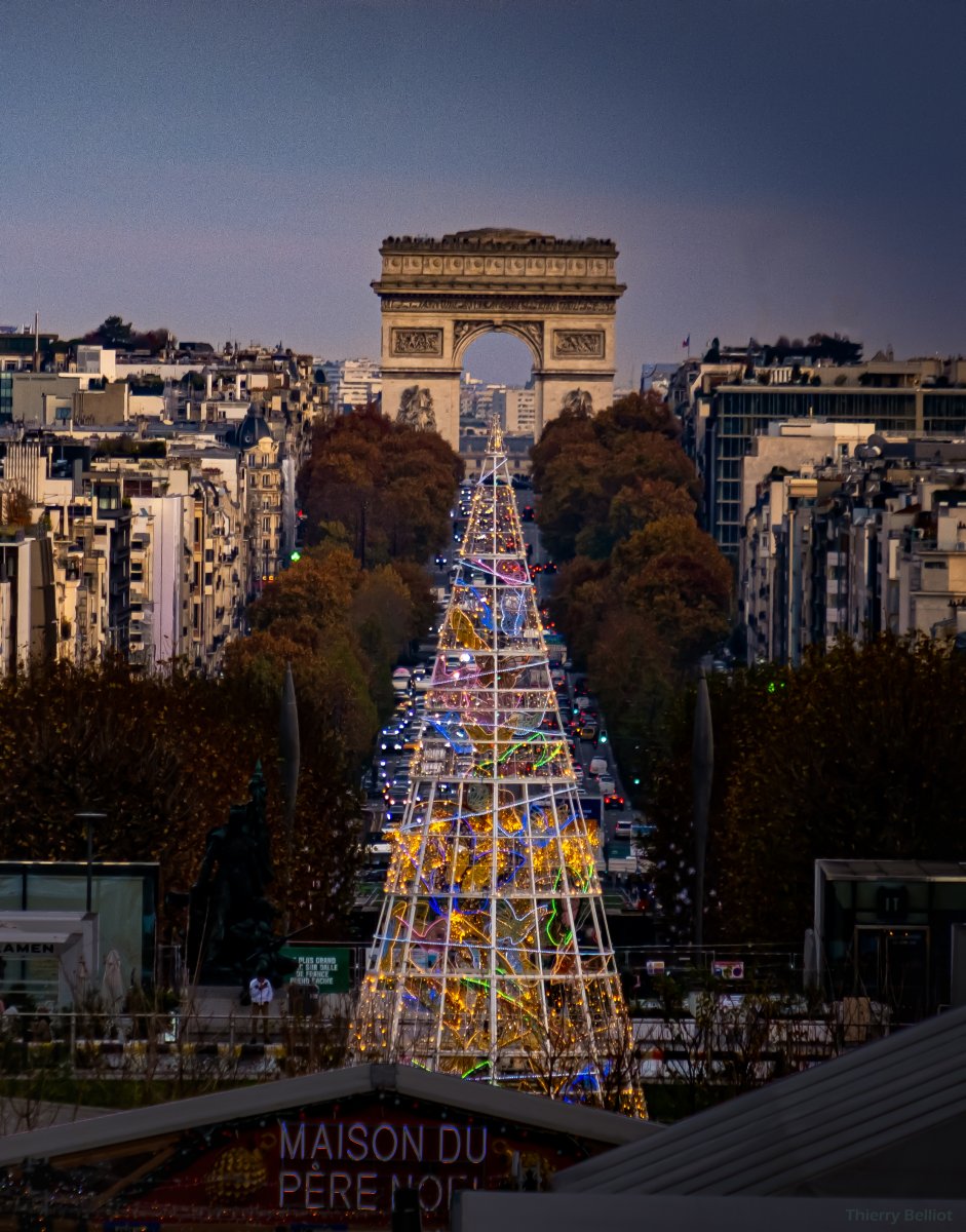 Le grand sapin artificiel du Marché de Noël de la Défense est idéalement placé pour créer cet effet visible lorsqu'on se trouve au pied de la Grande Arche.