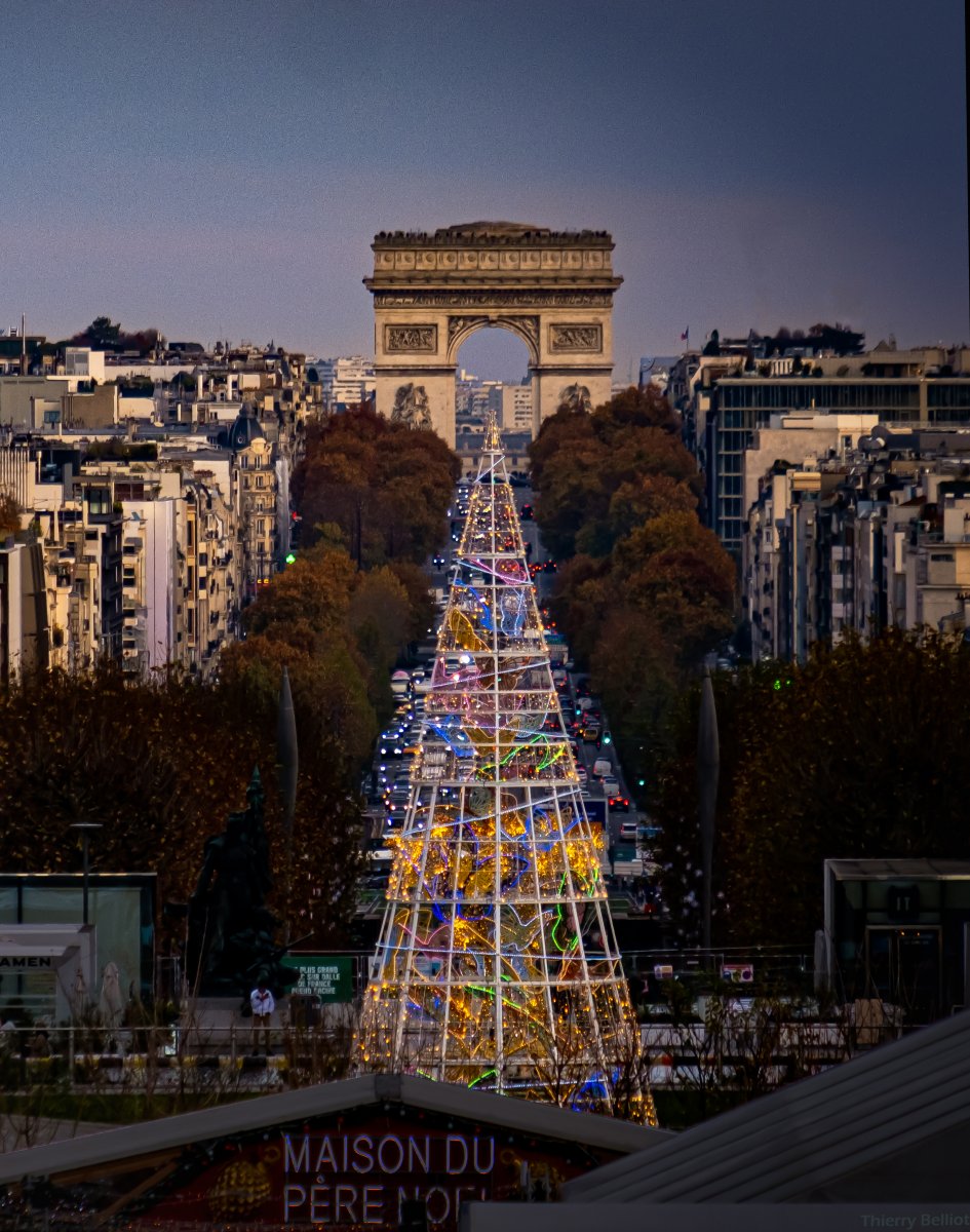 Le grand sapin artificiel du Marché de Noël de la Défense est idéalement placé pour créer cet effet visible lorsqu'on se trouve au pied de la Grande Arche.